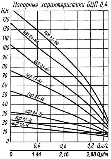 | Рис.2 Рабочие характеристики насосов БЦП 0,4, БЦП 0,63 | |