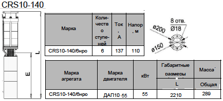 Рис. 1, 2: центробежный насос для скважины CRS 10-140/6 нро - напорные характеристики, габаритно-присоединительные размеры агрегата.