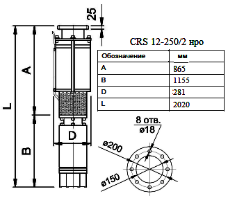 Рис. 1, 2: насос CRS 12-250/2 нро для скважины - рабочие характеристики, габаритно-присоединительные размеры агрегата.