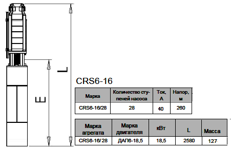 - 18,5: квт, мощность электродвигателя насоса CRS 6-16/28.