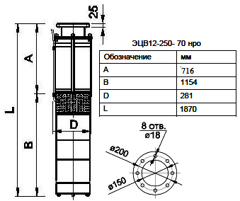 Рабочие и технические характеристики насоса, параметры насосного агрегата ЭЦВ 12-250-70 нро: