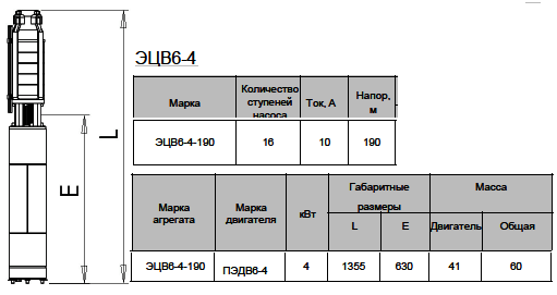 ЭЦВ 6-4-190 - характеристики технические и рабочие, параметры насоса: