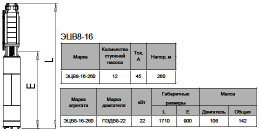 Характеристики технические и напорные ЭЦВ 8-16-260, параметры электроагрегата:
