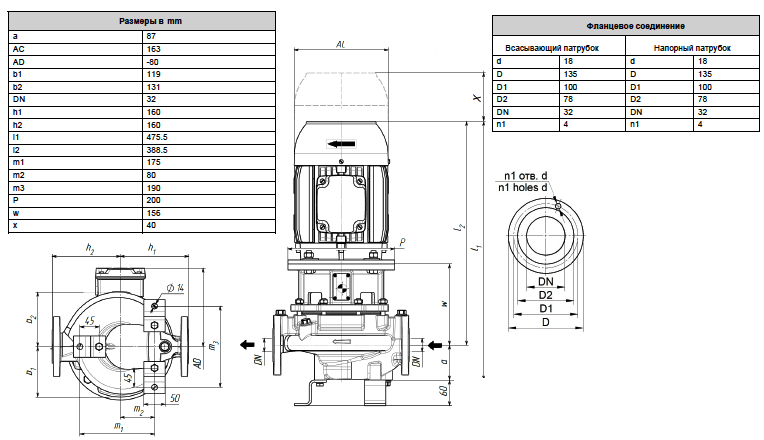 - 32: диаметр патрубков насоса на входе и выходе, мм;